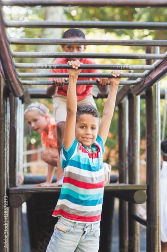 © WavebreakMediaMicro, Obraz premium Schoolboy hanging on horizontal bars