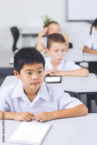 © vectorfusionart, Fototapeta premium Schoolboy sitting in classroom