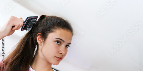 © Bonsales, Fototapeta premium schoolgirl brushes long ponytail with stylish hairbrush against bathroom wall in morning close view