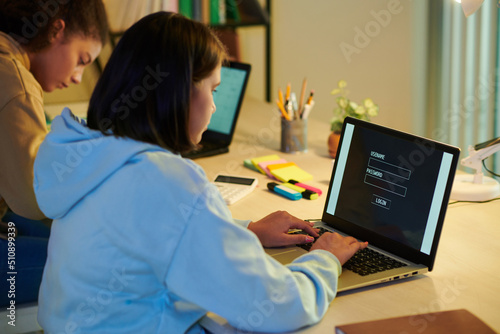 Fototapeta premium Schoolgirl entering e-mail and password to get access to online learning platform