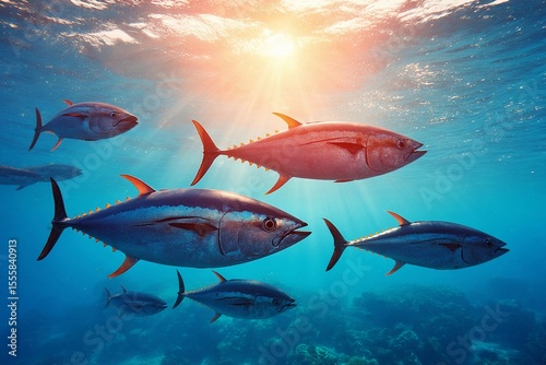 Fototapeta premium Schools of fish swim gracefully in clear ocean waters during sunset