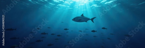 Fototapeta premium Schools of small fish swim beneath a vast expanse of dark blue ocean surface,...
