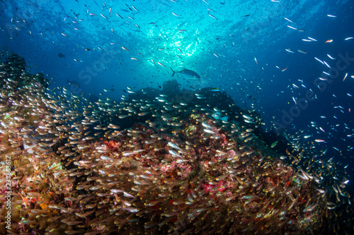 Fototapeta premium Schools of Tropical Fish on a colorful, healthy coral reef