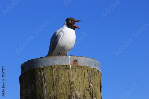 © Derkie, Fototapeta premium Schreiende Lachmöwe auf einem Poller