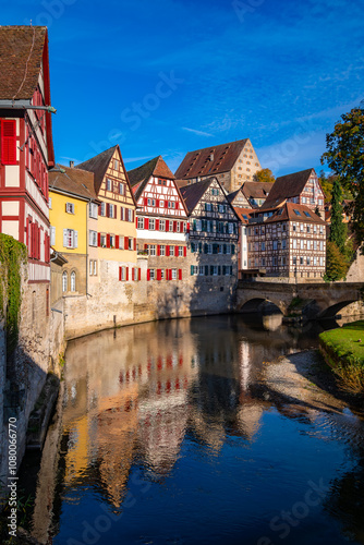 Naklejka premium Schwäbisch Hall is a picturesque small town in Baden-Württemberg (Germany). Historic old town buildings with colorful half-timbered facades and a stone bridge are reflected in River Kocher in autumn.