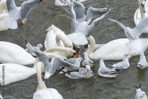 Obraz premium Schwäne und Lachmoewen streiten sich um Futter.