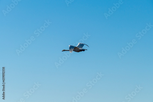 © HeiSpa, Fototapeta premium Schwan fliegt mit breiten Flügeln der Sonne entgegen