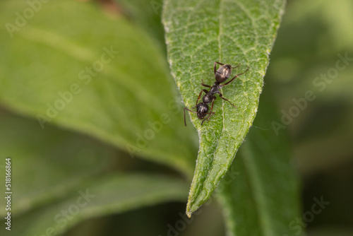 Fototapeta premium Schwarze Ameise auf grünem Blatt makro