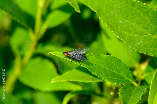 © MFOTO, Fototapeta premium Schwarze Fliege auf grünen Blatt