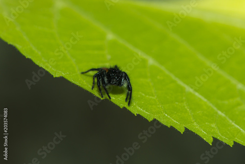 © nounours1, Fototapeta premium Schwarze Springspinne sitzt auf einem Blatt
