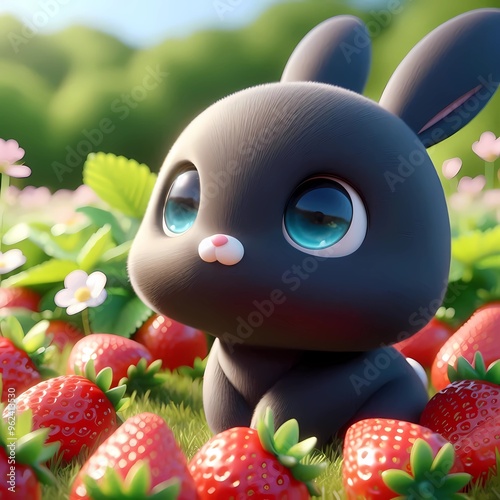 Naklejka premium Schwarzer Hase im Erdbeerfeld