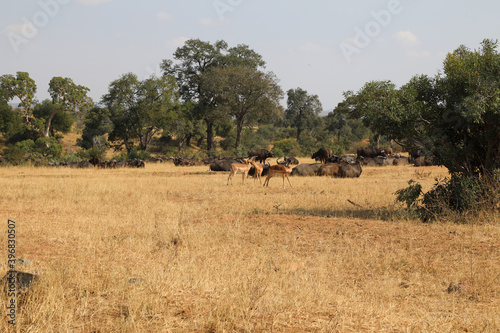 Obraz premium Schwarzfersenantilope und Kaffernbüffel / Impala and Buffalo / Aepyceros melampus et Syncerus caffer