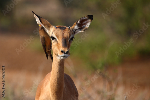 © Ludwig, Fototapeta premium Schwarzfersenantilope und Rotschnabel-Madenhacker / Impala and Red-billed oxpecker / Aepyceros melampus et Buphagus erythrorhynchus.