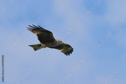 © Kay, Fototapeta premium Schwarzmilan fliegt am Himmel mit einer Coronamaske in den Krallen