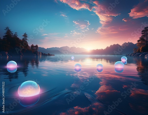 Obraz premium Schwebende Lichtkugeln über Wasser