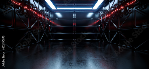 Fototapeta premium Sci Fi Futuristic Shaped Alien Spaceship Metal Planes Garage Glowing Red...