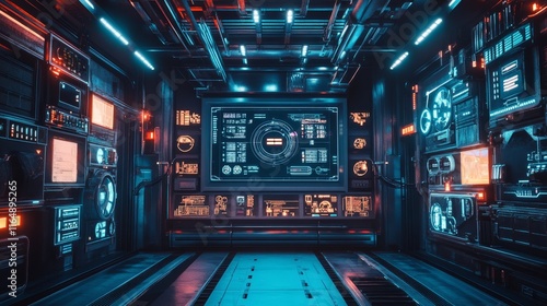 Fototapeta premium Sci-fi industrial control room with floating holographic panels and intricate...