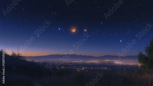 Naklejka premium sci-fi inspired night sky photograph, featuring a rare celestial alignment of planets.