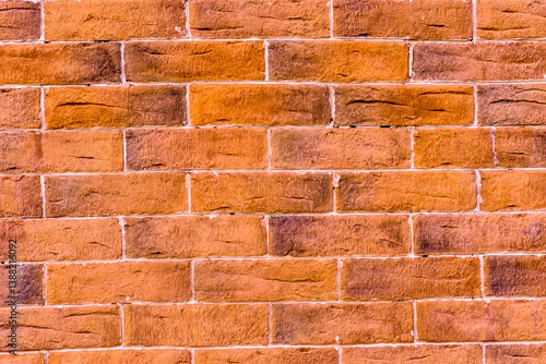 Obraz premium Ściana z dekoracyjnych pomarańczowych cegieł z białymi spoinami zaprawy....