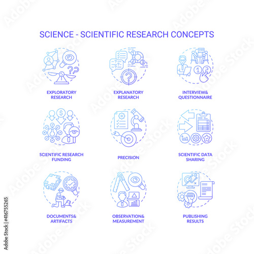 © IMG visuals icons, Fototapeta premium Science and scientific researching dark gradient concept icons set. Scientific research funding idea thin line RGB color illustrations. Scientific theory. Vector isolated outline drawings