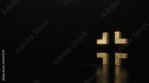 Fototapeta premium science glitter gold glitter symbol of exit 3D rendering on dark black background with blurred reflection with sparkles