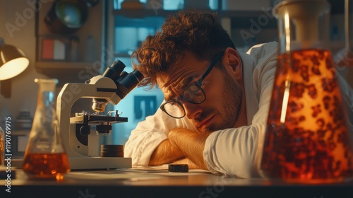 © Johannes, Naklejka premium science research, work and people concept - tired male scientist with microscope working in laboratory