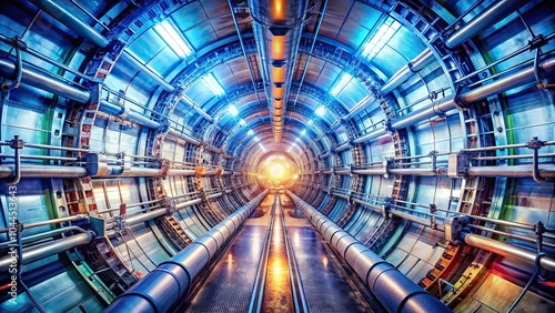 © JKLoma, Obraz premium Scientific particle accelerator experiment with subatomic collision in wide angle view