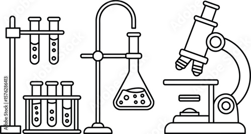 Obraz premium Scientific Research Microscope, Test Tubes, and Erlenmeyer Flask Illustrations
