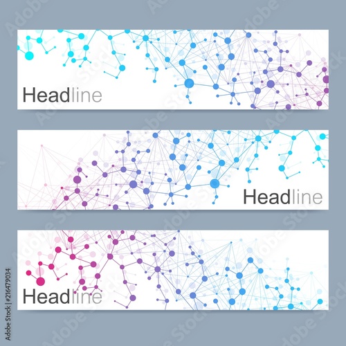 © pro500, Fototapeta premium Scientific set of modern vector banners. DNA molecule structure with connected lines and dots. Science vector background. Medical, tecnology, chemistry design.