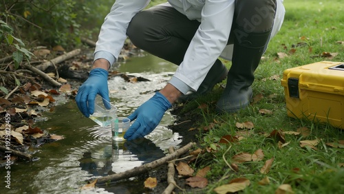 © Camila, Naklejka premium Scientist collecting water sample from stream