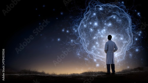 Fototapeta premium Scientist observes glowing abstract cell in starlit sky representing...