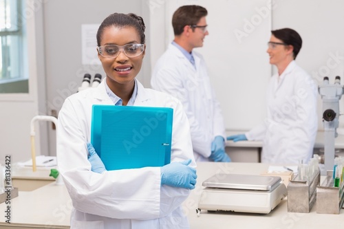 Fototapeta premium Scientist smiling at camera while colleagues talking together