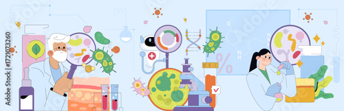Obraz premium Scientists Analyzing Microorganisms with Magnifying Glass
