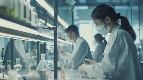 © VK Studio, Obraz premium Scientists at a lab bench, dressed in white lab coats and face masks, engage in precise and focused experiments, emphasizing research and innovation.