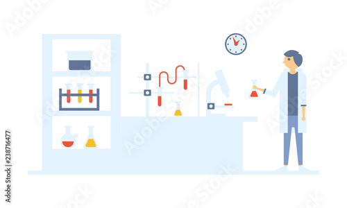Fototapeta premium Scientists at work in a chemical laboratory, biological, chemical or biotechnological research process vector Illustration