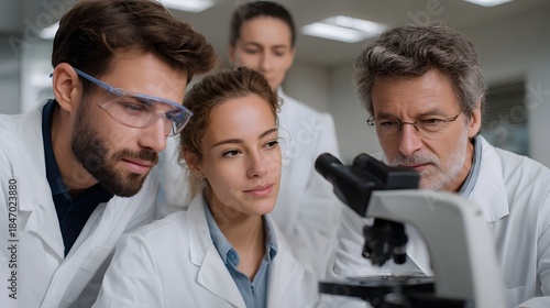 © Bussakon, Fototapeta premium Scientists collaborating in a laboratory analyzing samples under a microscope