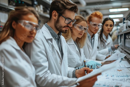 © fotofabrika, Fototapeta premium Scientists in Lab Coats Review Research Data in Laboratory Setting