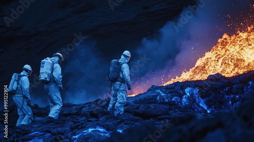 © Timeless Touch, Obraz premium Scientists studying the unique properties of blue lava at a volcanic site