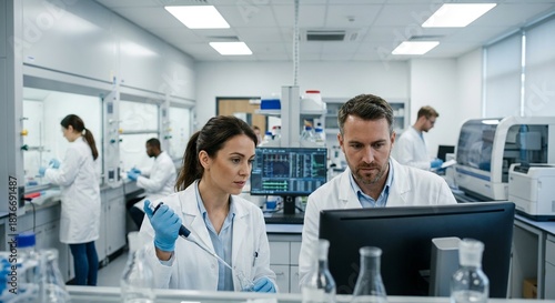 Fototapeta premium Scientists working together in modern laboratory setting