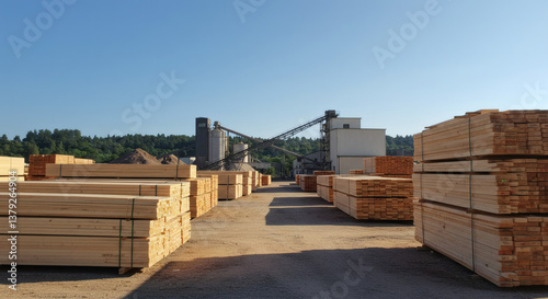 © InoStudiox, Fototapeta premium Scierie avec grues et bois empilé