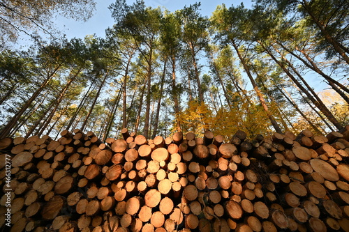 © Pawe, Fototapeta premium Ścięte drzewa w lesie z niebem