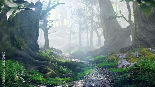Naklejka premium ścieżka przez magiczny las o wschodzie słońca, tajemnicze stare drzewa, krajobraz fantasy