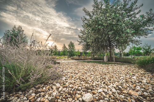 Naklejka premium ścieżka wysypana jasnym żwirem w ogrodzie lub parku