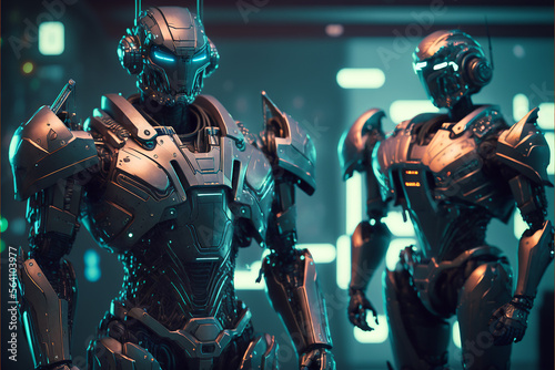 © Putrasatria, Fototapeta premium Scifi robot war background. Generative AI