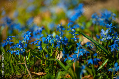 Fototapeta premium scilla siberica, Blue scilla siberica flowers close up with green vertical