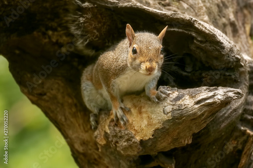 Obraz premium scoiattolo grigio nella cavità di un tronco nel bosco