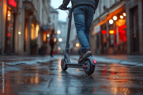 Fototapeta premium Scooter rider navigating a rain-soaked street in a lively city during dusk