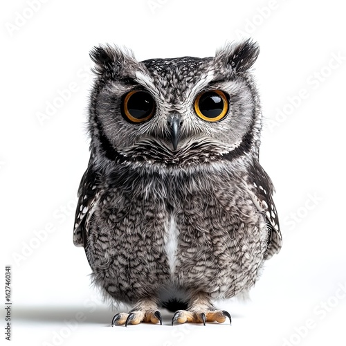 © Spikie, Fototapeta premium scops owl sitting still, small compact body covered in mottled brown and gray feathers, short ear tufts raised, large golden eyes staring