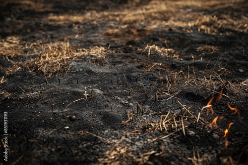 Fototapeta premium Scorched Earth Landscape: Spring Fires Destroy Grass in Nature Background