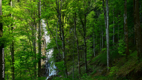 Obraz premium Scorusu waterfall seen through a dense and wild beech tree forest. Summer...